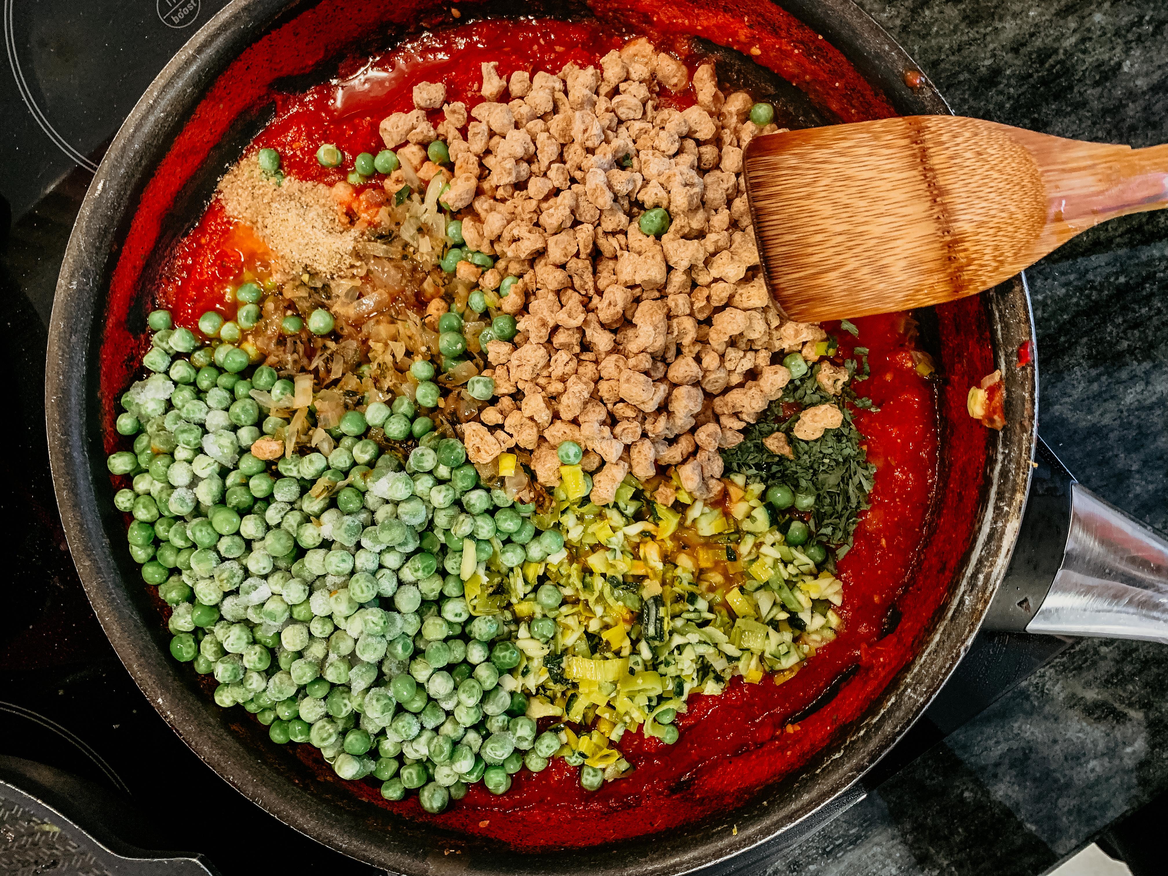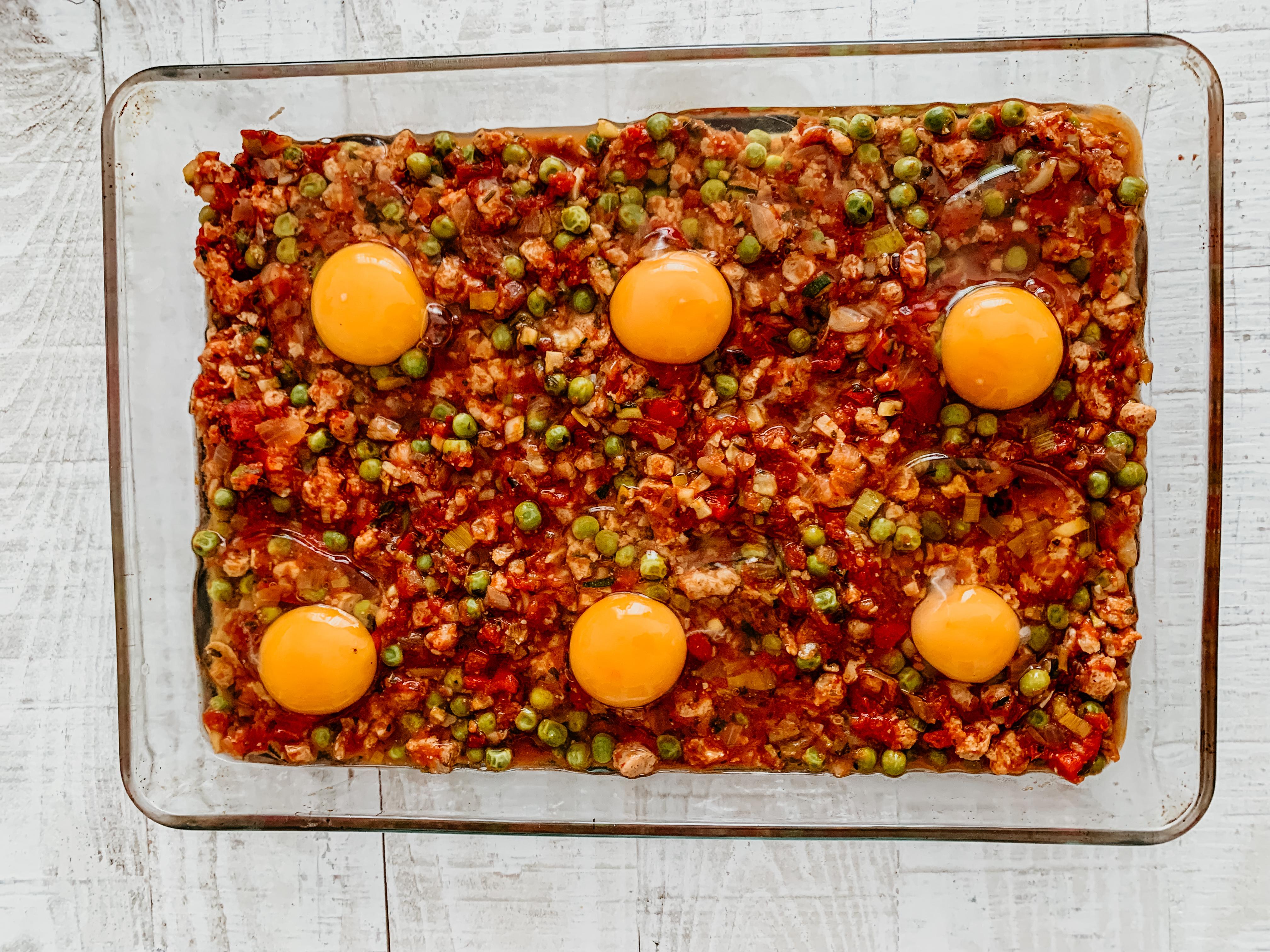 6. Ahora añadiremos los guisantes a nuestra sartén y la soja texturizada. Cuando la soja esté blanda (entre 10 y 15 minutos) lo apartaremos todo el fuego y lo pondremos en un recipiente apto para horno. Cuando ya esté colocado y bien repartido, pondremos unos 4-6 huevos repartidos por encima y añadiremos un poco de queso rallado