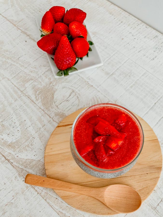 2. Limpiaremos y trituraremos las 6 fresas y, pasados los 30 minutos de reposo, las pondremos encima. La mezcla de chía y leche debería haber quedado espesa y como una “gelatina.