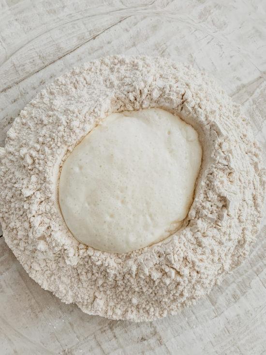 1. En primer lugar, ponemos en un bol la harina, la sal y el azúcar, y lo removeremos todo bien, dejando un hueco en el medio.