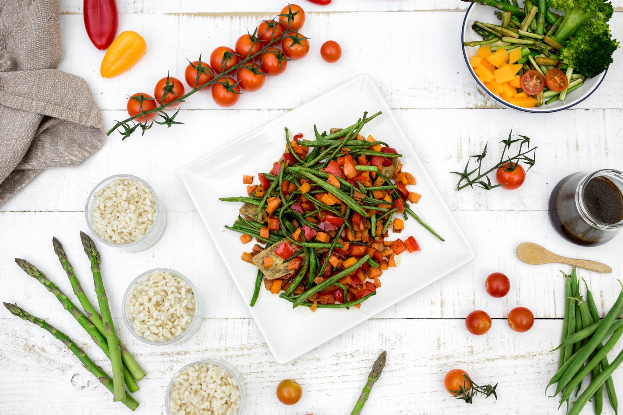 200 g tofu (un paquete) / 100 g judías verdes cortaditas / 60 g zanahoria en cubitos o pimiento rojo, o bien ambos / 15 ml aceite de sésamo tostado para saltear (o aceite de coco)