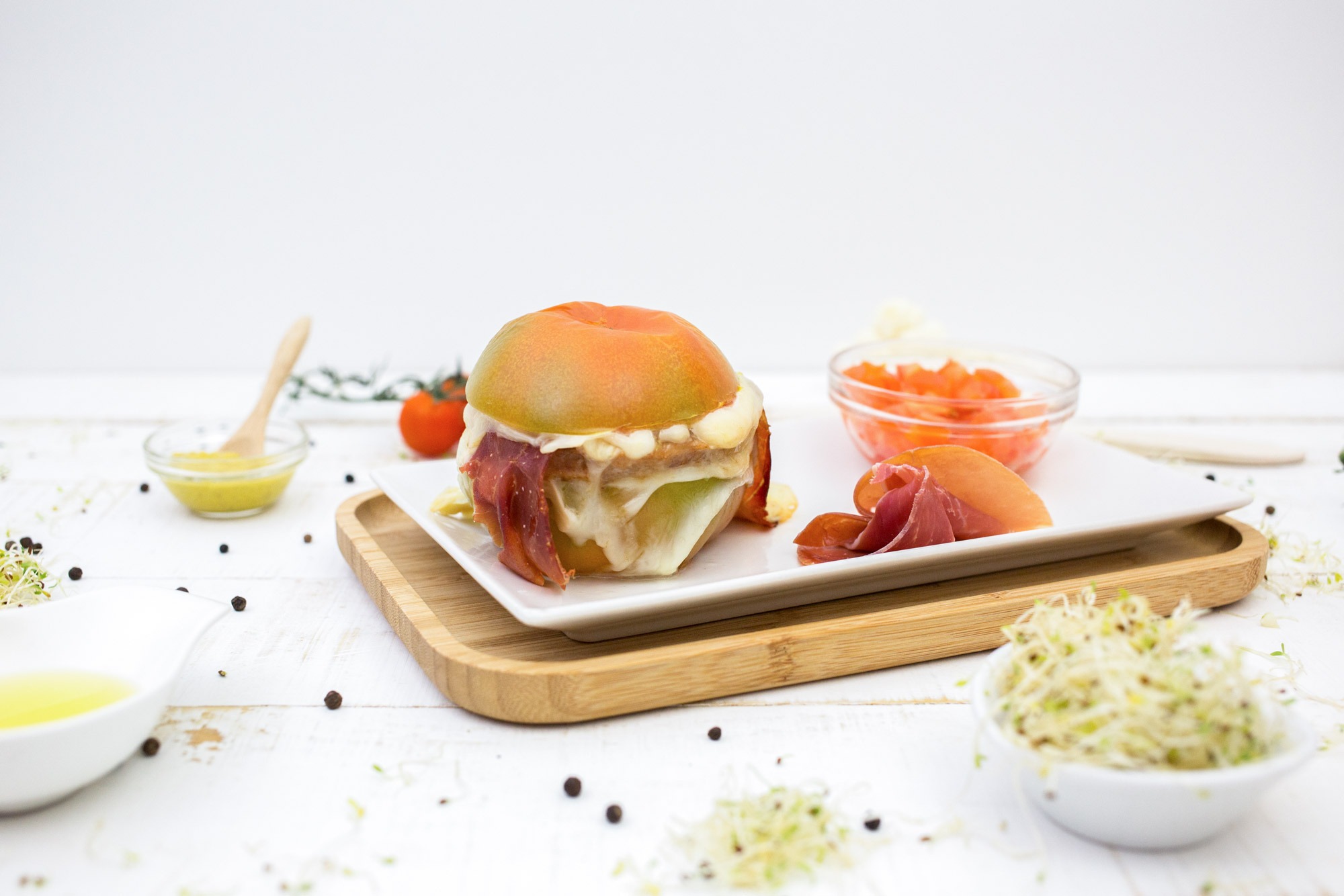 2. Ahora añadiremos las lonchas de jamón serrano o el queso sobre una mitad del tomate, y la hamburguesa ya cocinada sobre la otra mitad.