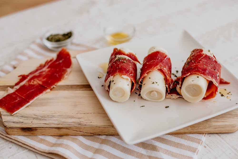 Lo único que tienes que hacer es coger 3, 4, 5 o 6 palitos de palmito (dependiendo del hambre que tengas) y los envuelves en 3 lonchas de jamón. Puedes envolver dos palmitos por loncha, hacer pequeños bocados… lo que prefieras. Intenta elegir un jamón que apenas contenga grasa.