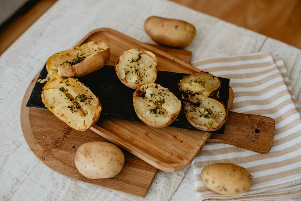 Lavamos y cortamos las patatas. Las ponemos en una fuente para horno con las especias que hayamos elegido y un chorrito de aceite de oliva. Horneamos a 200ºC durante unos 30-40 minutos.
