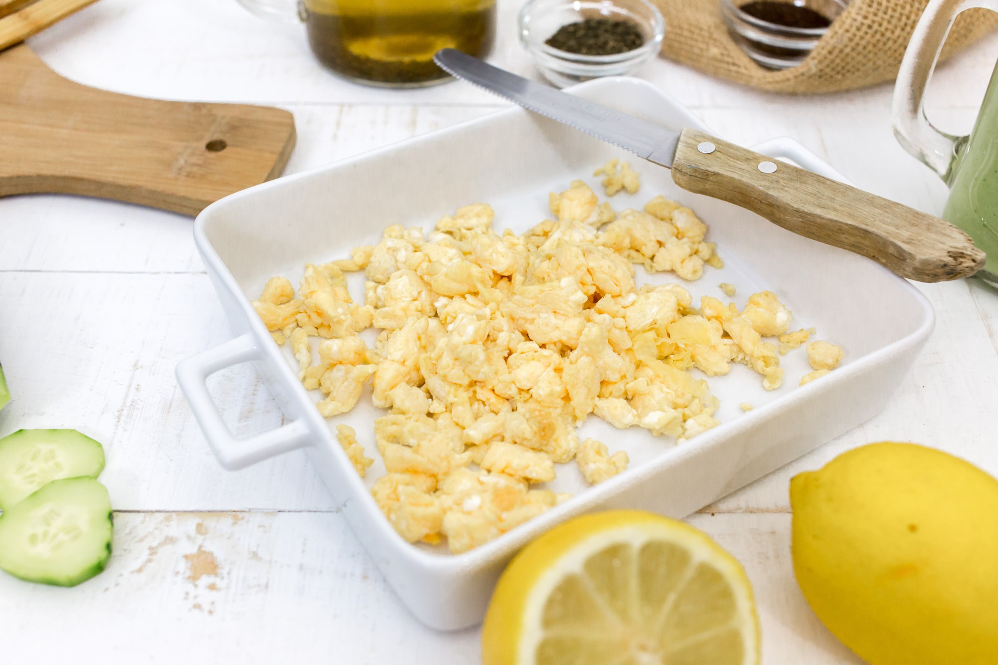 1- Hacemos los huevos revueltos en una sartén a fuego medio.