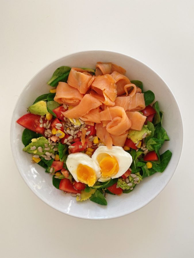 - Agregamos salmón ahumado o natural, maíz, aguacate cortado y semillas.