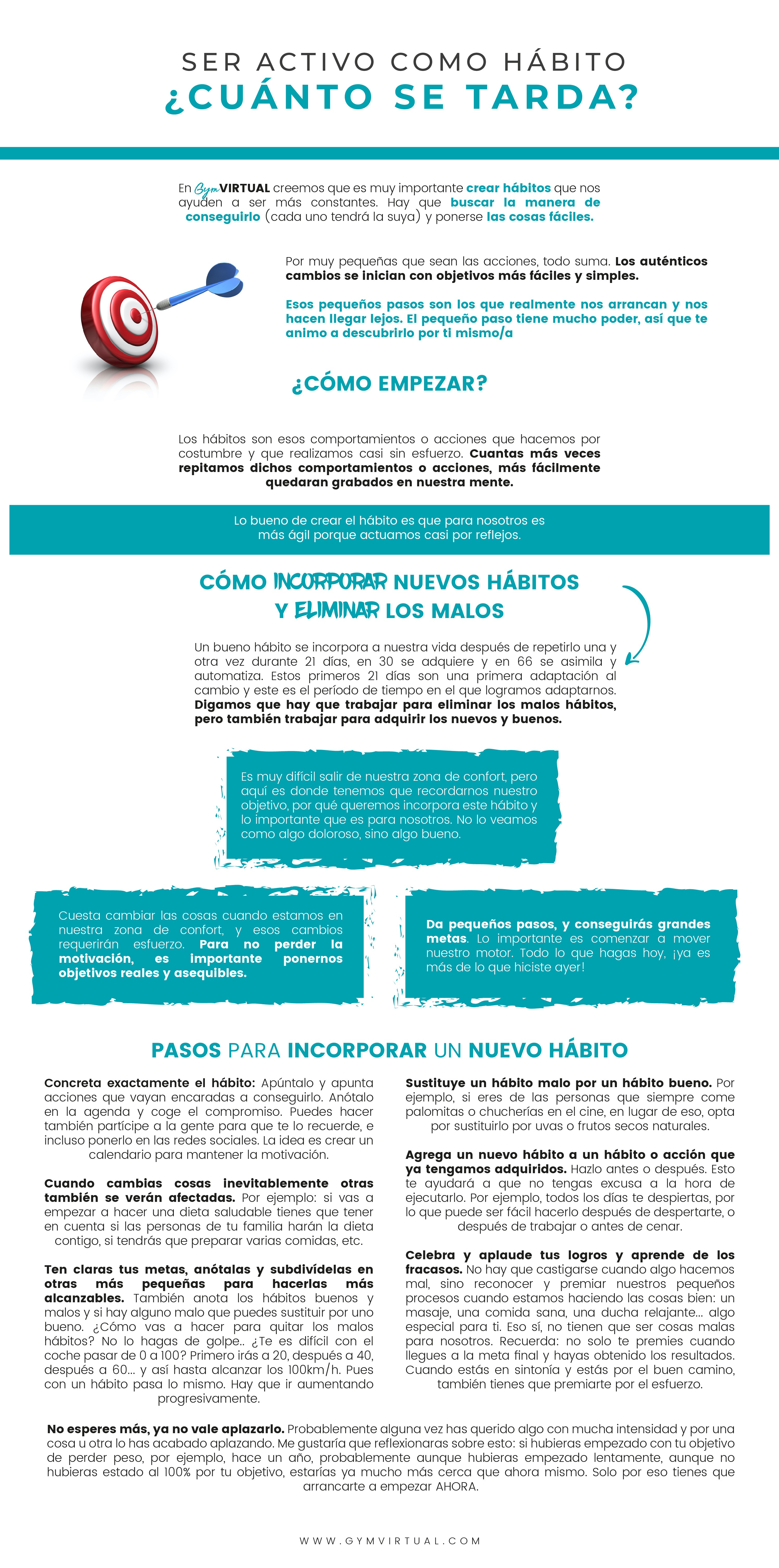 Un bueno hábito se incorpora a nuestra vida después de repetirlo una y otra vez durante 21 días, en 30 se adquiere y en 66 se asimila y automatiza. Estos primeros 21 días son una primera adaptación al cambio y este es el período de tiempo en el que logramos adaptarnos. Digamos que hay que trabajar para eliminar los malos hábitos, pero también trabajar para adquirir los nuevos y buenos. Todo cambio necesita tiempo y ¡sobre todo unas buenas expectativas! Si piensas que no vas a llegar o vas a estar limitad@, tus hábitos y progresos ¡también lo estarán!